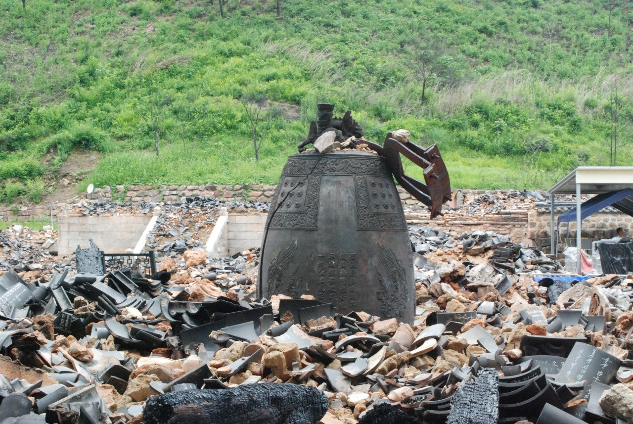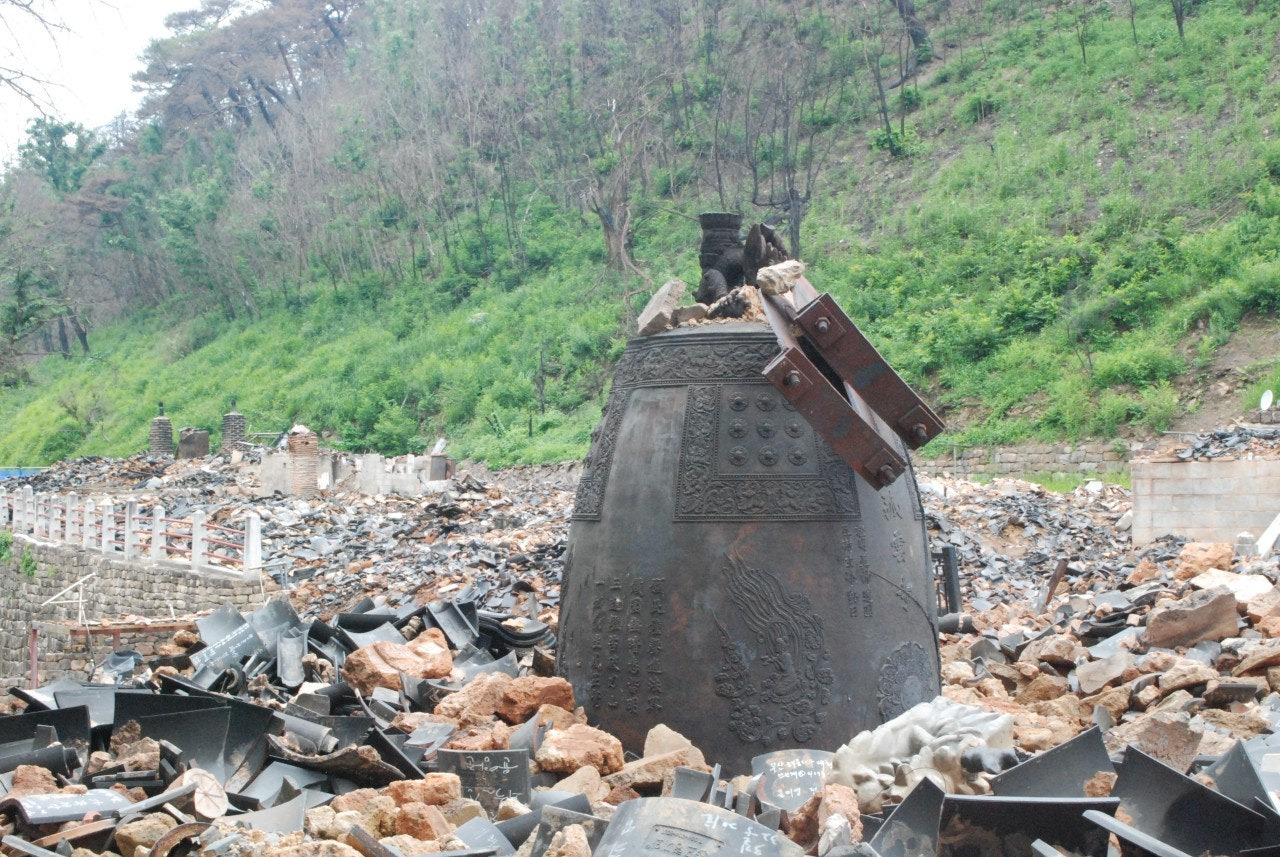 등운산 고운사로 가는 길 양쪽 산능선에 새로운 생명의 싹들이 돋아나고 있었지만, 화마가 휩쓸고 지나간 산들은 처참했다. 어떤 곳은 마을이 모두 사라져 버린 곳도 있었다. 고운사 안내를 예약한 최금희 해설사가 웅장하고 덩그런 일주문에서 기다리고 있었다. 일주문에서 옛날 스님들이 오가던 길을 따라 걷기로 했다. 후덥지근한 날씨 이지만 산불이 휩쓸고 지나간 자연의 재앙을 만나기로 했다. 일제시대 송진을 체취했다는 흔적이 뚜렷한 아름드리 소나무도 일제의 만행은 이겨냈지만 산불에는 무너지고 말았다. 새까많게 탄 산림사이에서 새로운 생명들이 올라오며 꽃을 피우고 있었다. 자연의 경이로움이다. 천왕문과 약사전은 그나마 남아있었다. 범종각과 가운루가 있던 자리에는 화마가 지나간 처참한 흔적 만 남아있었다. 샘물이 흐르는 곳에서 멍하게 불탄자리를 바라보았다. 불이 난곳을 치우고 전각을 지을 것이 아니라 자연재해의 경각심을 일깨워주는 장소로 보존했으면 한다. 중생에게 장엄한 불법의 진리를 깨우치게 했던 법종도 화마를 이기지 못하고 덩그란히 있었다.