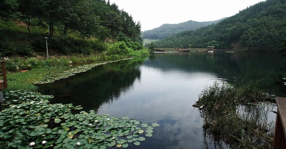 자연과 인공의 아름다운 조화, 수원지 전망대에서 바라보는 주미산은 물과 산이 잘 어우러져 마치 한 폭의 동양화 같은 아름다운 풍경을 선사한다. 둘레길을 2곳으로 정한 것은 나무그늘을 찾아 서늘함이 있는 곳으로 선정했습니다