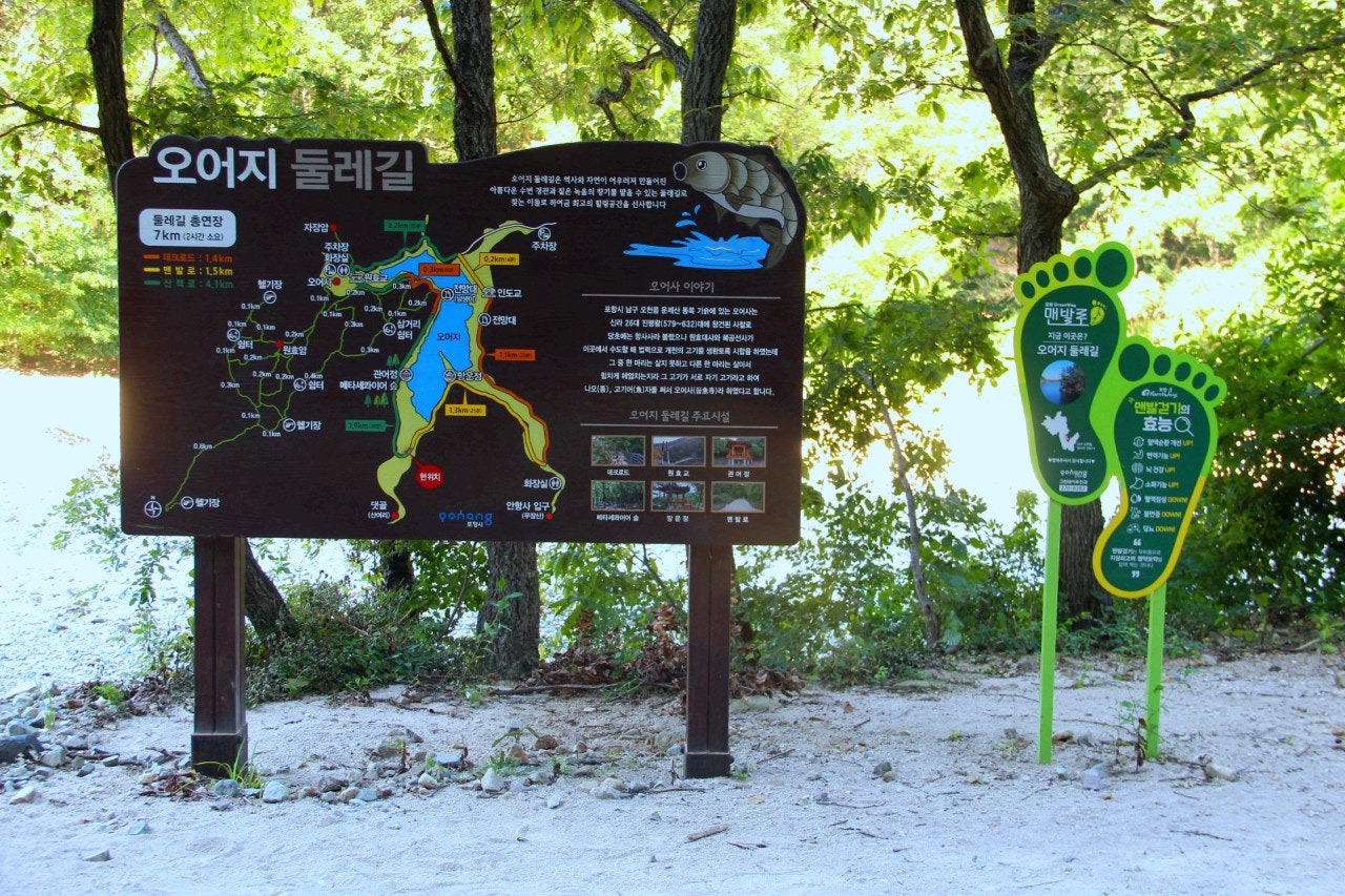 길고도 멀기만 하다. 오랜만에 오어지 둘레길을 걸어보았다. 우드데크를 따라서 저수지 한 바퀴를 돌고 원효,혜공,의상,자장 등 사성(四聖)이 머물렀던 천년 고찰인 오어사 부처님 께 문안 인사 드리고 일주문 - 원효교 - 혜공교를 거쳐서 애마를 묶어둔 저수지 뚝방까지 원점회귀하는데 대략 7키로, 1시간 50분 소요되었다. 예전에 없던 데크길과 주변 산책로가 잘 정비되어 걷기가 훨씬 수월해졌다
