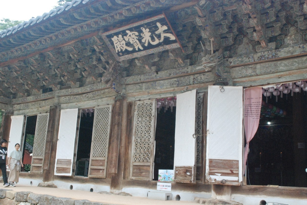 제389차(20250913)충남공주:꿈엔들 잊힐리야! 고즈넉한 절집 '마곡사' 기행1. 오늘 폭우가 쏟아진다는 일기 예보가 있었다. 그러나 차창 밖으로 보이는 하늘은 높고, 산은 푸르렀다. 예전에 곡식이 부족하여 배고픈 시절에는 들판이 적고 산이 많은 것이 불만이었지만 지금은 맑 은공기와 맑은 물을 주는 산이 고맙고 좋다. 2시간 정도를 달려 마곡사 주차장에 도착했다. 해설사는 절집 일주문에서 만나기로 약속되어 있었다. 데크로 이어지는 샛강을 따라가는 길에는 노점상이 공주에서 유명한 밤을 내놓고 있었다. ‘春마곡’이란 별칭에서 알 수 있듯이 봄볕에 생기가 움트는 마곡사의 태화산은 나무와 봄꽃들의 아름다움이 빼어 나다. 마곡사지에 따르면 '마곡사는 643년(의자왕 3년)에 신라의 고승 자장율사가 창건한 것으로 전해오고 있으며 고려 명종(明宗) 때인 1172년 보조국사(普照國師)가 중수하고 범일(梵日) 대사가 재건했다. 도선국사가 다시 중수하고 각순 대사가 보수한 것으로 전해지고 있다. 조선시대에는 세조가 이 절에 들러 ‘영산전(靈山殿)’이란 사액을 주었다.