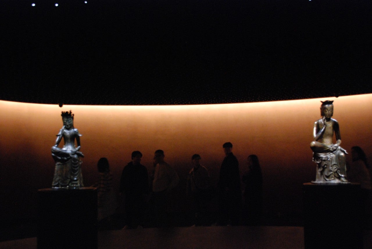 어둠이 가득한 방에서 흐릿한 반가사유상을 보고 있으니 번민과 깨달음이 찾아왔다. 평화와 평안의 안락함도 더불어 찾아왔다. ‘사유의 방’ 입구에서 부제를 글로 읽고 화두로 삼아 멀고 길게 느껴지는 어둡고 좁은 통로를 막연히 따라갔다. 오른편으로 꺾어 돌면 길쭉하고 붉은 바닥의 공간이 반겨주었다. 모든 것에서 편안함을 느낄 수 있었다. 반가사유상을 올려보다 천천히 돌아서서 걸었다. 좀처럼 보기 어려운 반가사유상의 뒷모습을 만났다. ‘사유의 방’은 곡선의 아름다움이 담겨있다. 떠나야 할 시간이 되어 방을 나섰다. '반가사유상은 미래불인 미륵보살이 세상을 구제할 방법을 깊이 생각하는 모습을 표현한 관으보살 불상'이다.